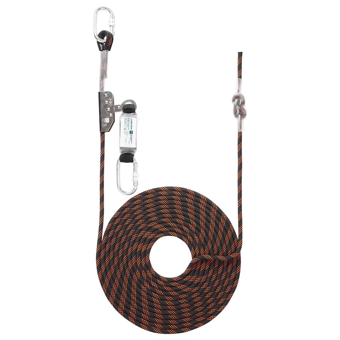 Πλήρες σύστημα ανακοπής πτώσης με σχοινί kernmantle 12mm, ιδανικό για καθοδήγηση και ασφάλεια κατά την εργασία σε ύψος. Περιλαμβάνει απορροφητή ενέργειας και δύο καραμπίνερ για ασφαλή σύνδεση και αξιοπιστία.